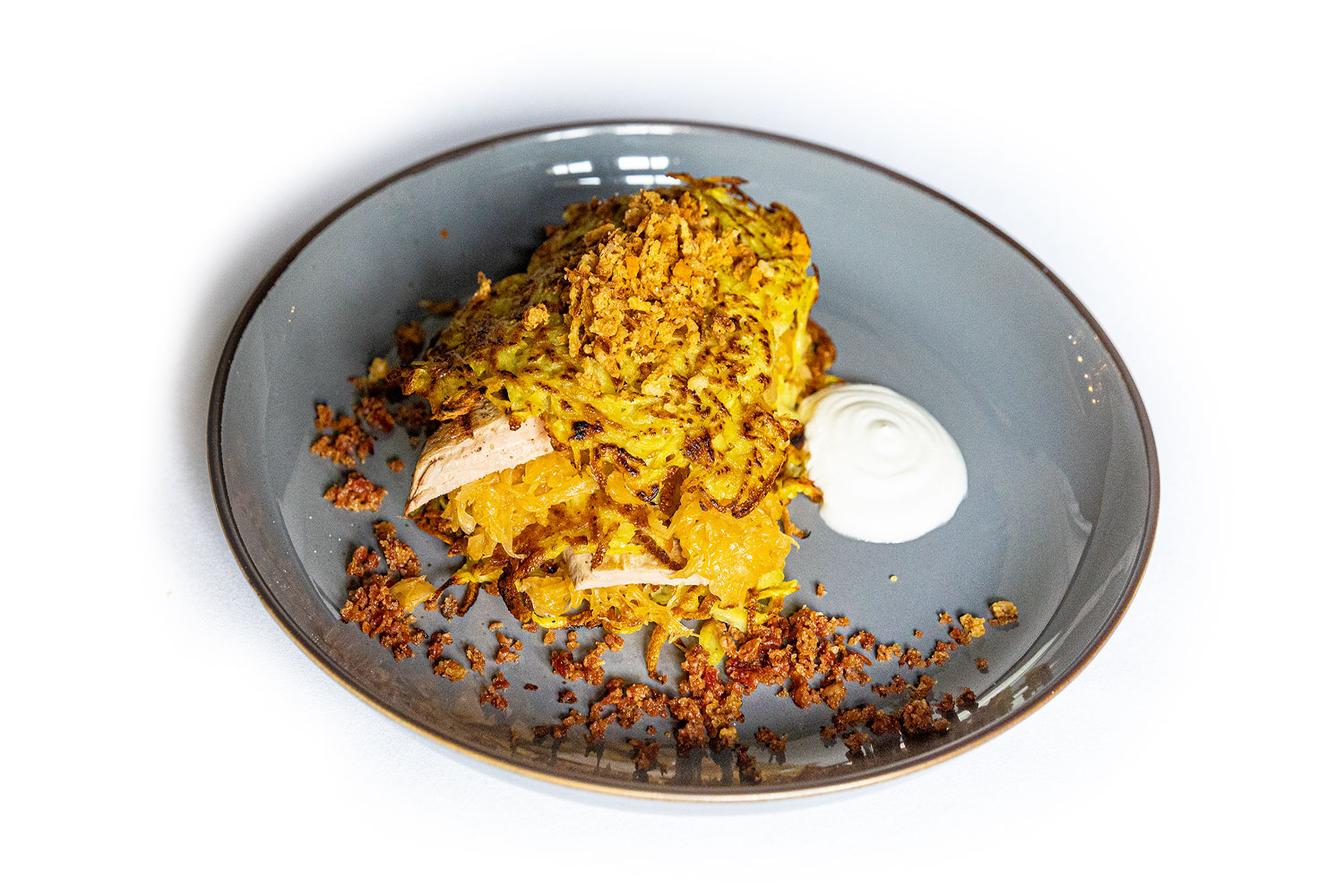 KONFITOVANÁ ŠPIKOVANÁ KRKOVIČKA KONFITOVANÁ ŠPIKOVANÁ KRKOVIČKA /ZEMIAKOVÉ RÖSTI / KARAMELIZOVANÁ KYSLÁ KAPUSTA / VIEDENSKÁ CIBUĽA / CRÉME FRAICHE / SLANINOVÝ PRACH 150g 1,7 15.90 €